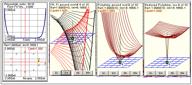 Fig. Graphs of polynomial and roots, graphs of polynomial real and imaginary parts, graphs of polynomial amplitude / reduced amplitude - in vicinity of one root (examples)